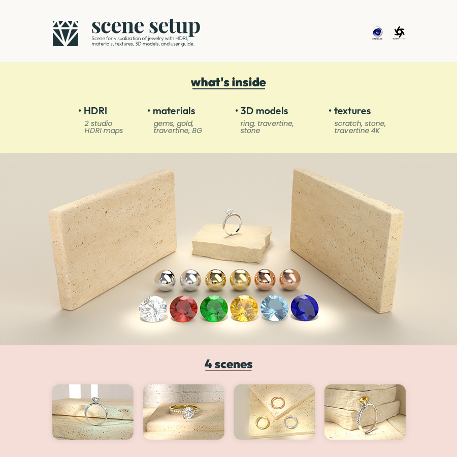 This professional scene pack is designed for photorealistic jewelry visualization. It features high-quality travertine textures, optimized HDRI lighting, and detailed 3D models to achieve realistic reflections and depth. Ideal for professionals and designers, these setups ensure precise material rendering and highlights to showcase the finest details in jewelry projects.